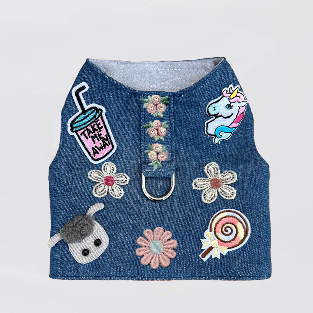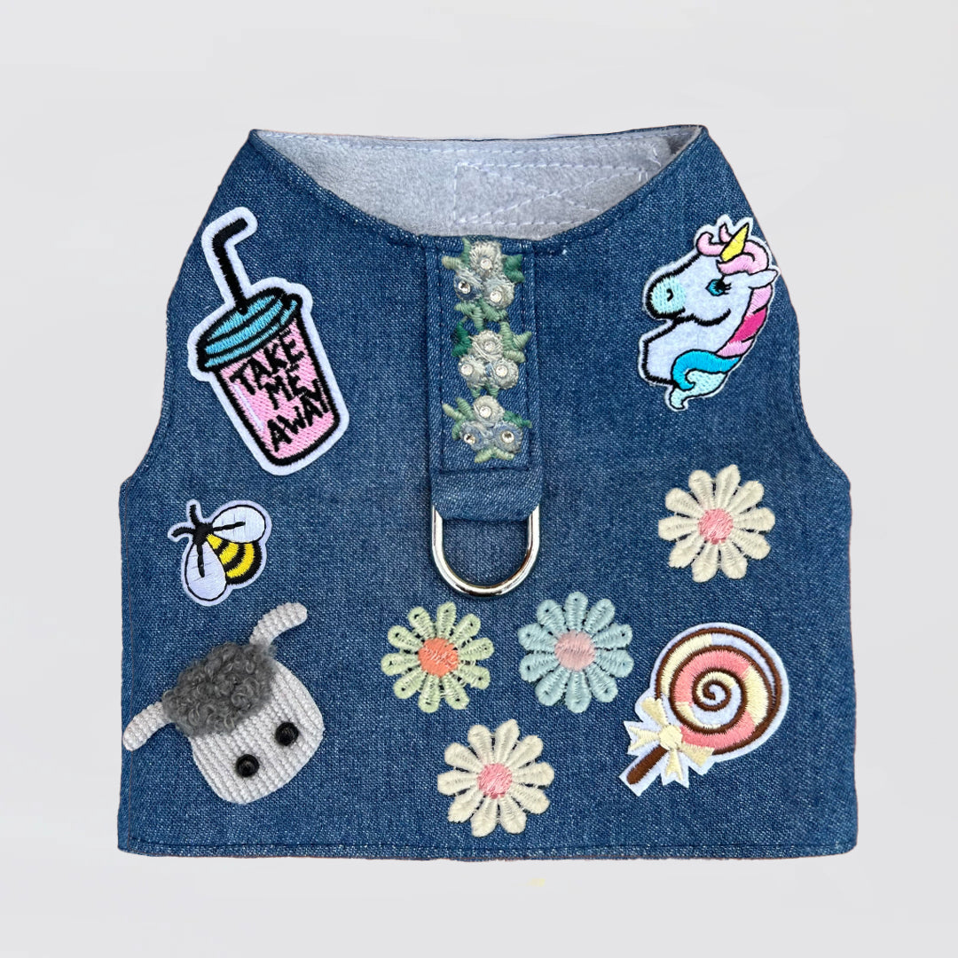 Introducing the stylish and functional Cool Pup Dog Harness by Hello Doggie! Crafted from denim fabric and luxuriously lined with micro suede, this harness is designed to provide both comfort and durability for your furry companion. The inclusion of a secure d-ring allows for tether attachment, ensuring your baby's safety during walks or outings. Thanks to the convenient Velcro straps, this harness is not only secure but also easy to put on and take off. The decorative patchwork and three flowers, available in blue or pink, add a touch of charm to the design, each adorned by genuine Swarovski crystals for a hint of sparkle. Treat your pup to the ultimate combination of fashion and practicality with the Cool Pup Dog Harness - a must-have accessory for every stylish pet parent and their cool pup! Wash in cool on gentle cycle, no bleach or softener and air dry or tumble on low.